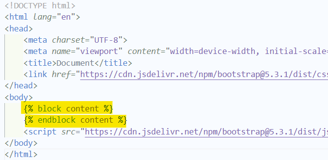 2. base.html에서 기본형식과 함께, 자식 템플릿에서 달라질 부분인 body에 block tag를 작성해준다.