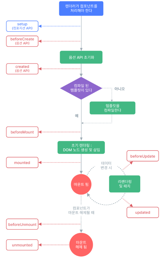 Vue 인스턴스의 생애주기 = createdApp에서부터 메모리에서 삭제될 때까지의 과정