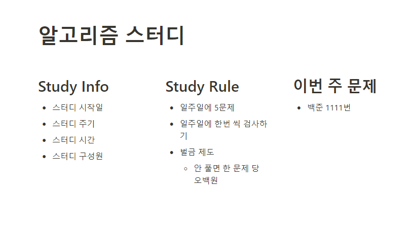 우선 이 넓은 페이지에 스터디 정보, 규칙, 이번주 같이 풀 문제를 써주기 위해서 칼럼을 나눠볼까요?