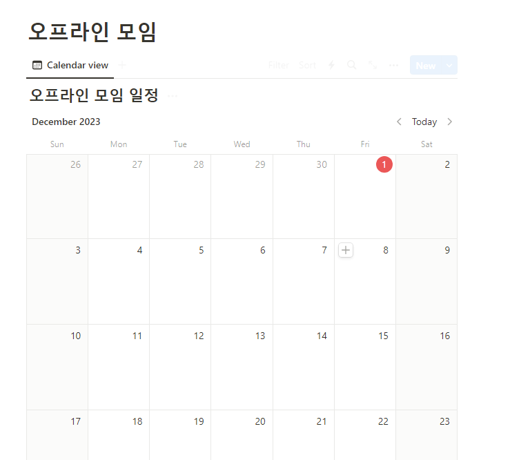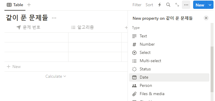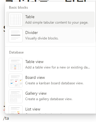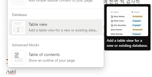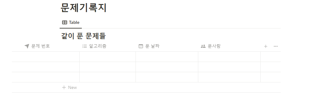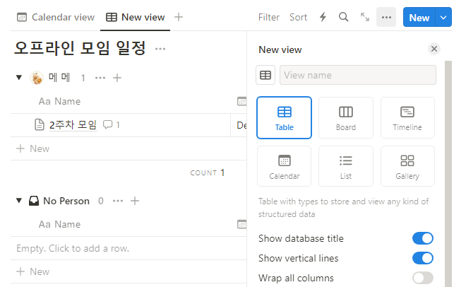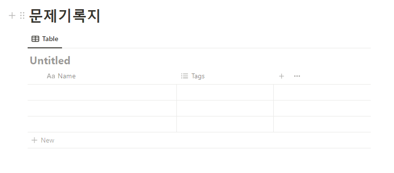 위에서와 같은 테이블은 노션의 Database에서 제공하는 Table view를 통해 만들 수 있습니다.