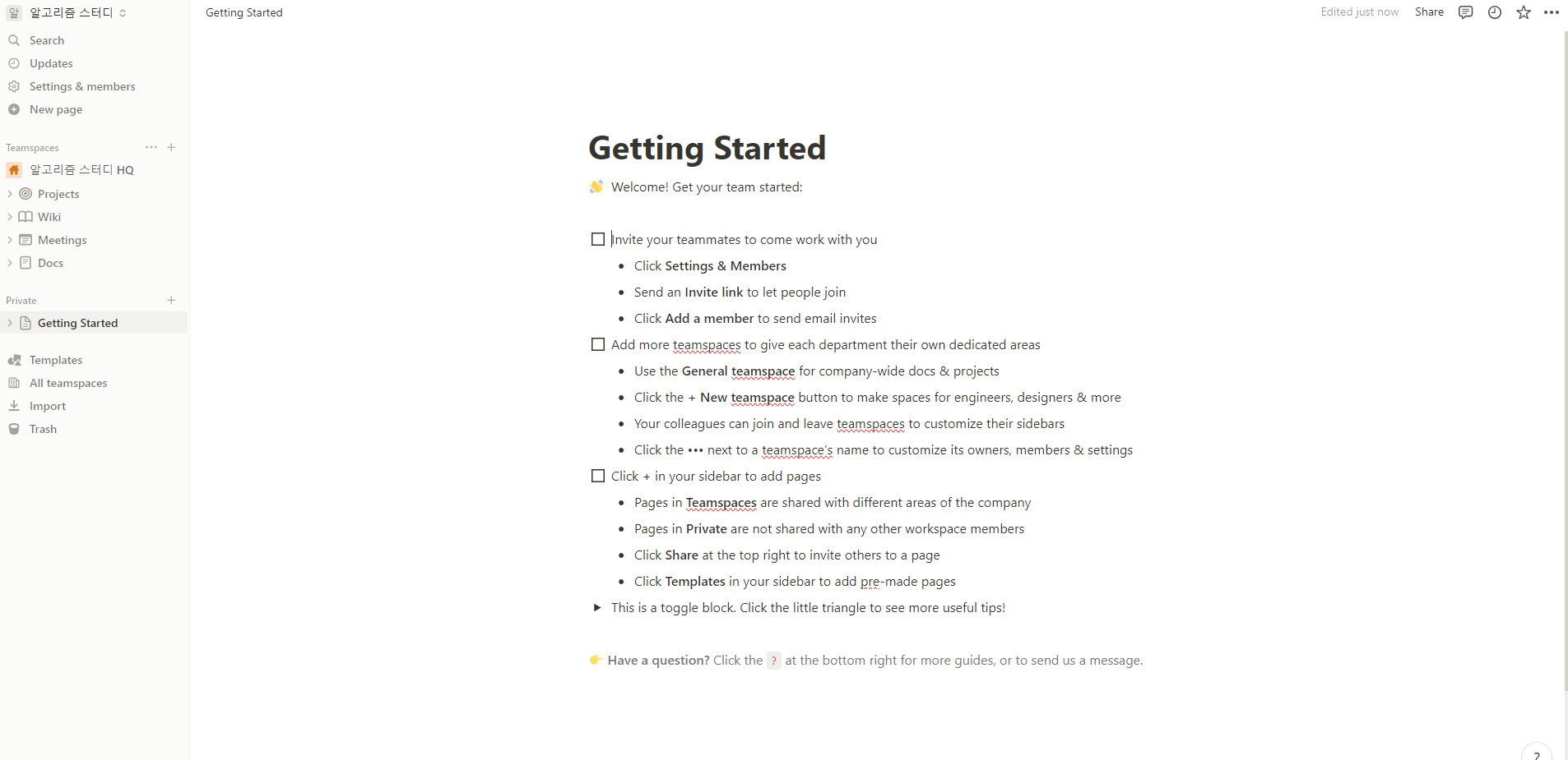 왼쪽 옆의 사이드바를 보면 Teamspaces와 Private로 나뉩니다.