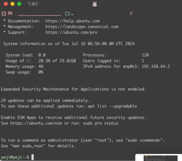 터미널에 ssh yeji@ip주소 를 입력하고, 비밀번호를 쳐주면 로컬에서 VM에 연결할 수 있다.