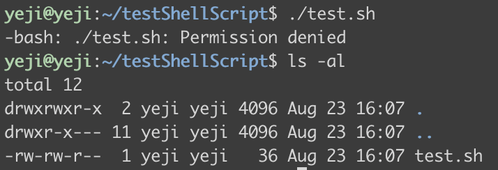 ๋ฅผ ์ ๋ ฅํ๋ฉด, permission denied๊ฐ ๋จ๋๋ฐ, ls -al๋ฅผ ํตํด ๊ถํ์ ํ์ธํด๋ณด๋ฉด ์คํ ๊ถํ์ด ์๋ค๋ ๊ฒ์ ํ์ธํ ์ ์๋ค.