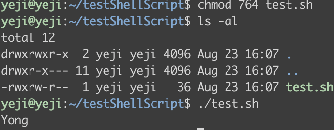 ๋ง์ฝ ์์๋ง x๋ฅผ ์ถ๊ฐํ๋ ค๋ฉด, chmod 764 test.sh๋ฅผ ํตํด ์์๋ง x๊ถํ์ ์ถ๊ฐํด์ฃผ์