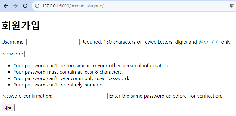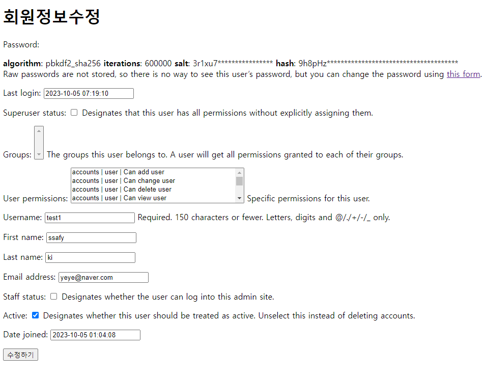 + 이후 회원 정보 수정에서 쓰는 UserChangeForm도 똑같다