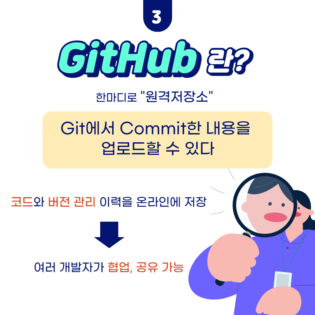 또한, GitHub는 한마디로 말하자면 원격 저장소라고 할 수 있습니다. 로컬 컴퓨터에서 Git을 이용해서 Commit한 내용을 업로드할 수 있는 공간입니다.