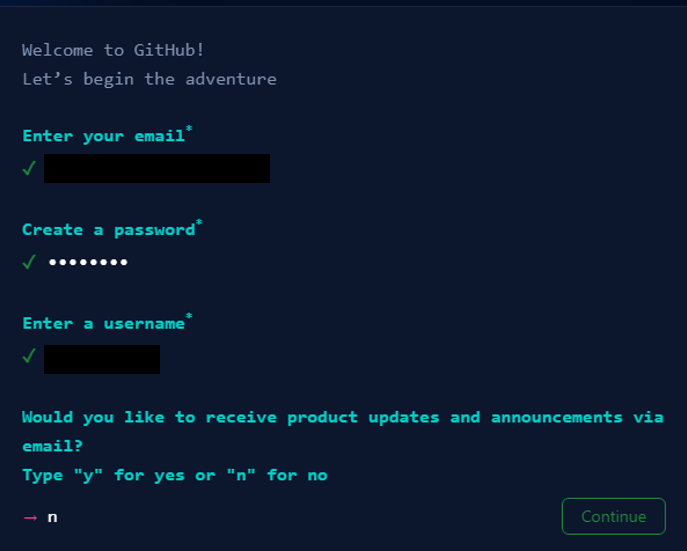 (1) https://github.com/에 접속해서 회원가입을 진행해 줍니다. 사이트 좌측 상단의 Sign up을 클릭한 후, 이메일과 비밀번호, 사용자 이름을 입력하고 이메일 인증까지 진행합니다.