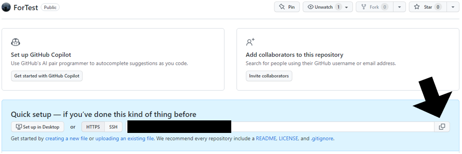 이후, 해당 저장소에 파일을 올리기 위해 화살표 표시에 있는 아이콘을 선택해서 미리 링크를 복사해 둘 수 있습니다.