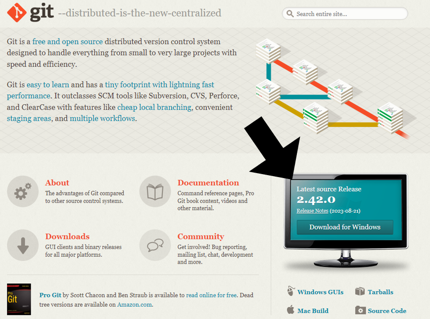 (1) https://git-scm.com/downloads에 접속해서 자신에 맞는 실행파일을 다운로드 받아 설치를 진행합니다.