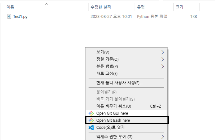 (1) 업로드를 할 파일의 위치에서 마우크 우클릭을 해서 'Open Git Bash here'을 선택해 줍니다.